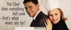 This American cooking advertisement probably from the mid to late 20th century displays a ad slogan “The Chef does everything but cook — that’s what wives for for!” simultaneously glorifies the title Chef as the male character and denigrates the woman’s role as the person who should be “cooking”. It reflects a traditional gender stereotype that has been prevalent for centuries.