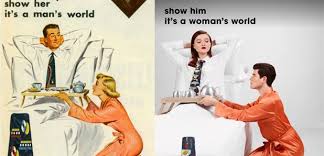 This traditional Van Heusen advertisement represents a more modern-day feminist makeover by representing the woman as a central figure in the advertisement. The man is kneeling down serving her with compliments and amenities. The slogan implies that the world essentially “revolves” around the women. This is an example that counters the status quo gender stereotype.